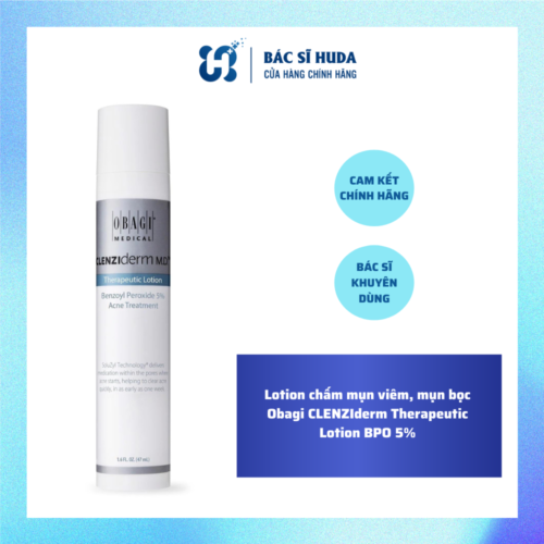 Lotion chấm mụn viêm, mụn bọc Obagi CLENZIderm Therapeutic Lotion BPO 5% một thành phần chống lại vi khuẩn mụn, thúc đẩy làn da khỏe mạnh và ngăn ngừa sự trở lại của mụn trứng cá. Thành phần giúp gom cồi mụn, giảm viêm,tẩy tế bào chết nhẹ nhàng tẩy tế bào chết làm tắc lỗ chân lông, nguyên nhân ngăn cản quá trình phục hồi của làn da.
