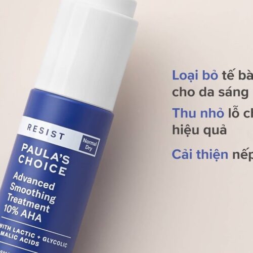Paula’s Choice Resist Advanced Smoothing Treatment 10% AHA không chỉ loại bỏ tế bào chết tối ưu mà còn cải thiện các vấn đề làn da đang gặp phải với công thức hoàn hảo gồm AHA, BHA cùng các dưỡng chất thiết yếu cho da . Hiệu quả sử dụng được nhìn thấy rõ rệt kể cả khi bạn sử dụng 1 lần/tuần. Bảng thành phần sản phẩm an toàn, lành tính cũng cho phép sử dụng với tần suất thường xuyên hơn tùy vào phản ứng làn da của bạn.Sản phẩm có độ pH lý tưởng cho da: 3.5 – 4.0